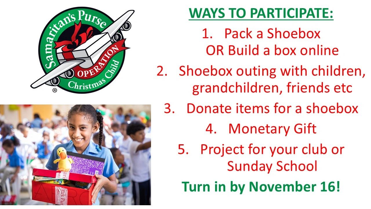 This year, you have the ability to pack a shoebox online through the link below, or grab a box at church and pack it yourself. This is a great way to share the love of Christ with kids around the world.